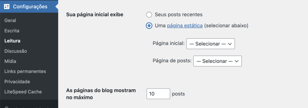 Em Página de posts deixe em branco caso não tenha uma área para blog em seu WordPress.