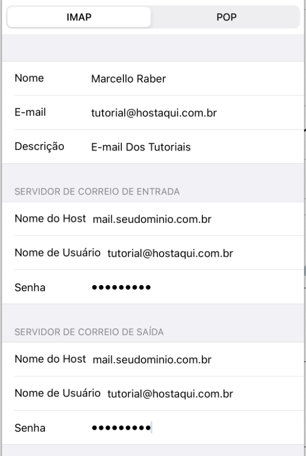 Não esqueça de conferir se está marcado como IMAP na parte superior e preencha nos campos Servidor de Entrada e Servidor de Saida suas informações de login do WebMail.